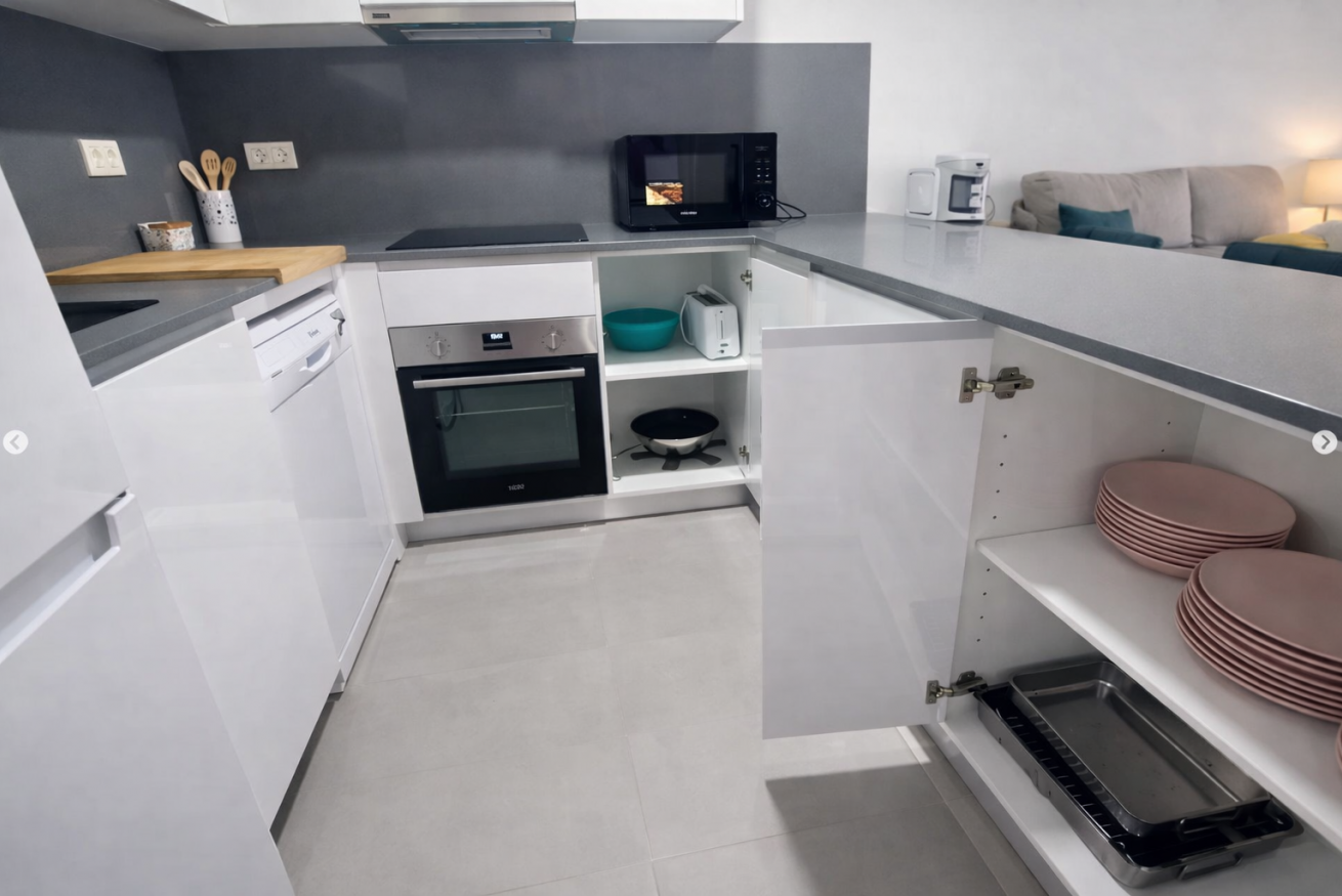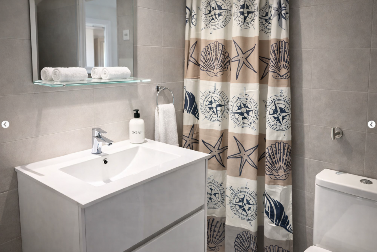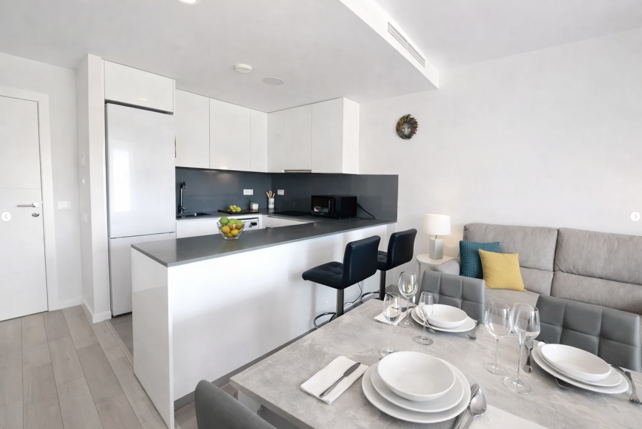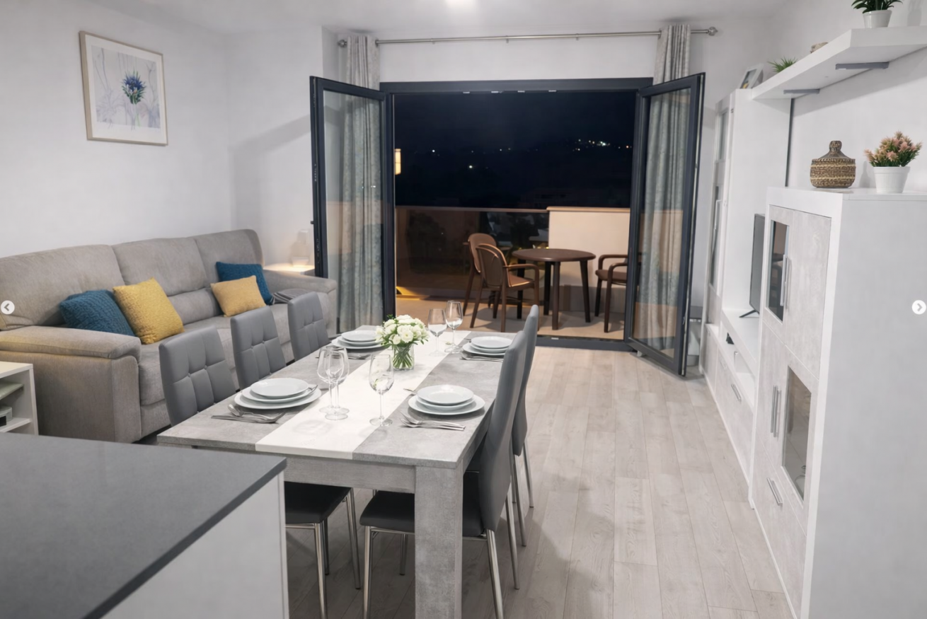 La vivienda dispone de 2 dormitorios, 2 baños completos y un amplio salón con sofá cama, ofreciendo espacio y confort para todos los huéspedes. La cocina americana totalmente equipada incluye todo lo necesario para estancias cortas o largas.