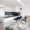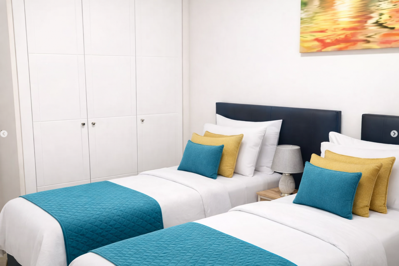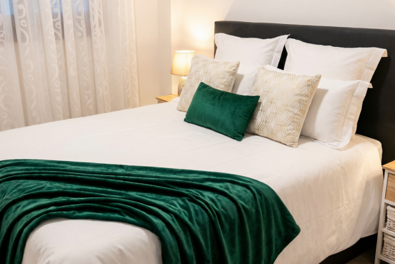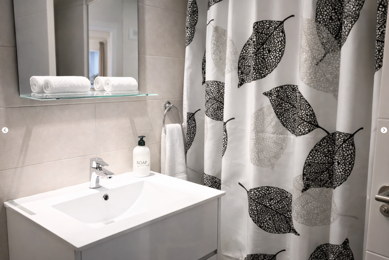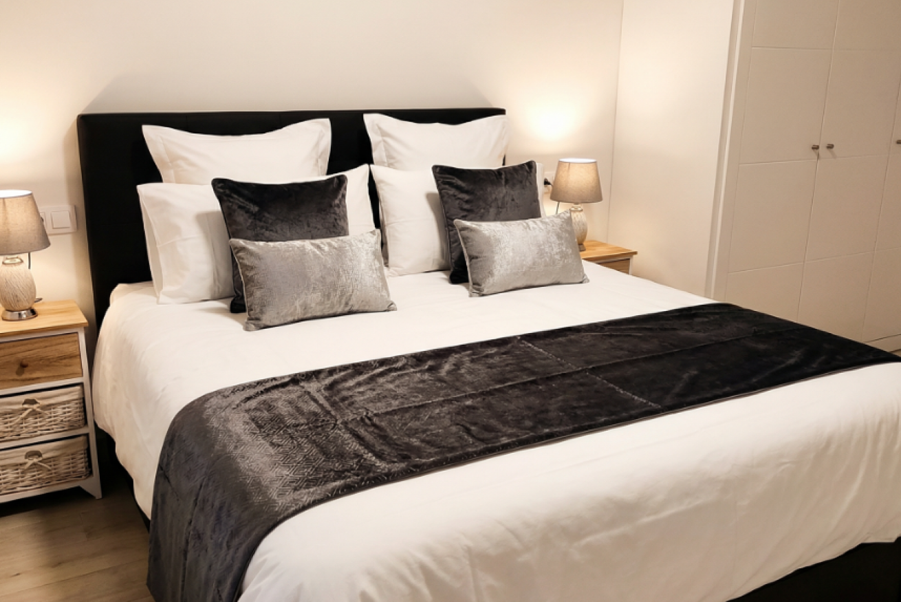La vivienda dispone de 2 dormitorios, 2 baños completos y un amplio salón con sofá cama, ofreciendo espacio y confort para todos los huéspedes. La cocina americana totalmente equipada incluye todo lo necesario para estancias cortas o largas.